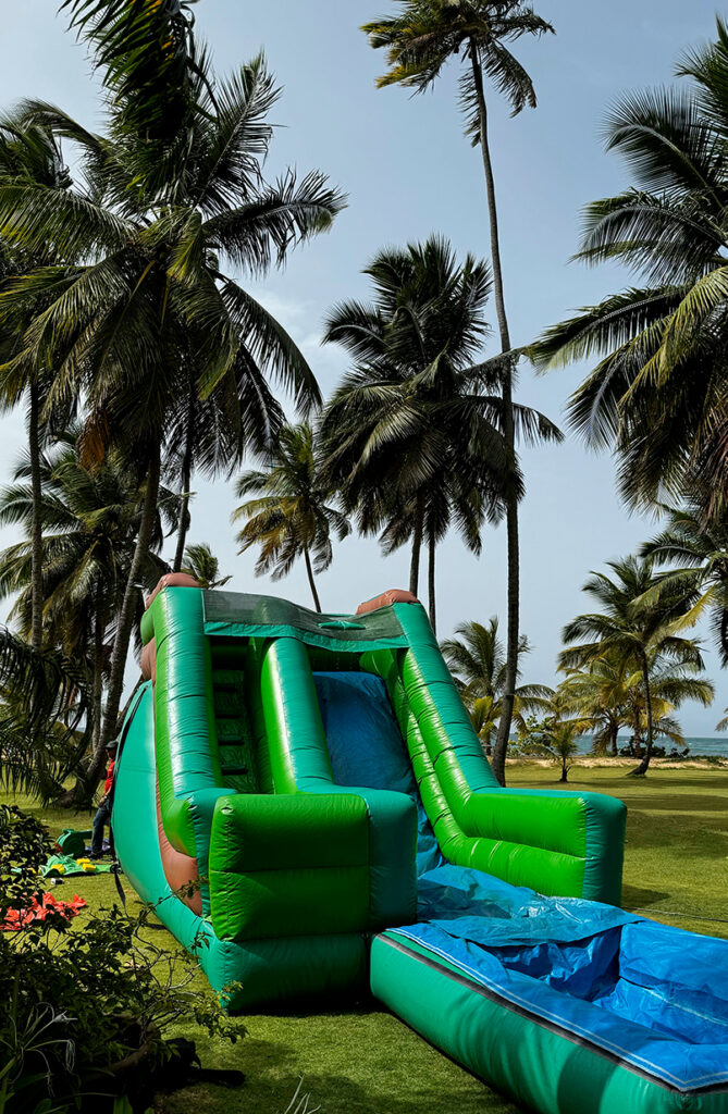 Este espectacular tobogán inflable temático tropical es perfecto para cualquier evento al aire libre. Con su diseño vibrante en tonos verdes y su estructura segura, garantiza horas de diversión para niños y adultos. La cuenta inflable con una rampa deslizante y una piscina en la parte inferior, lo que lo hace ideal para fiestas, reuniones familiares y celebraciones de verano. Además, está rodeado de palmeras, lo que le da un toque caribeño que complementa perfectamente cualquier ambiente.