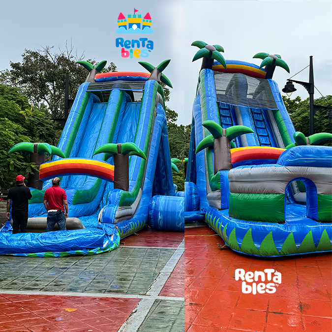 Lleva a tus invitados a una aventura llena de diversión y frescura con este increíble inflable de temática tropical. Su diseño con palmeras y colores vivos crea un ambiente de playa ideal para celebraciones al aire libre, especialmente en días soleados. Perfecto para fiestas infantiles, actividades familiares o cualquier evento donde quieras sorprender a los más pequeños y hacerlos sentir en una isla tropical.