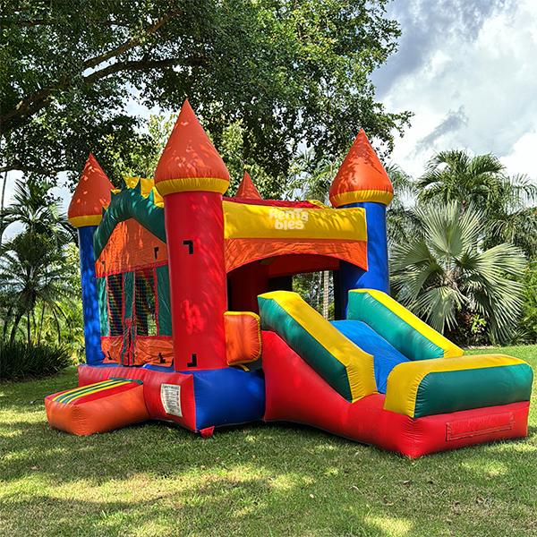 Con un diseño llamativo en tonos rojo, azul, amarillo, verde y naranja, combina un área para saltar protegida por mallas de seguridad, con un tobogán lateral de fácil acceso.