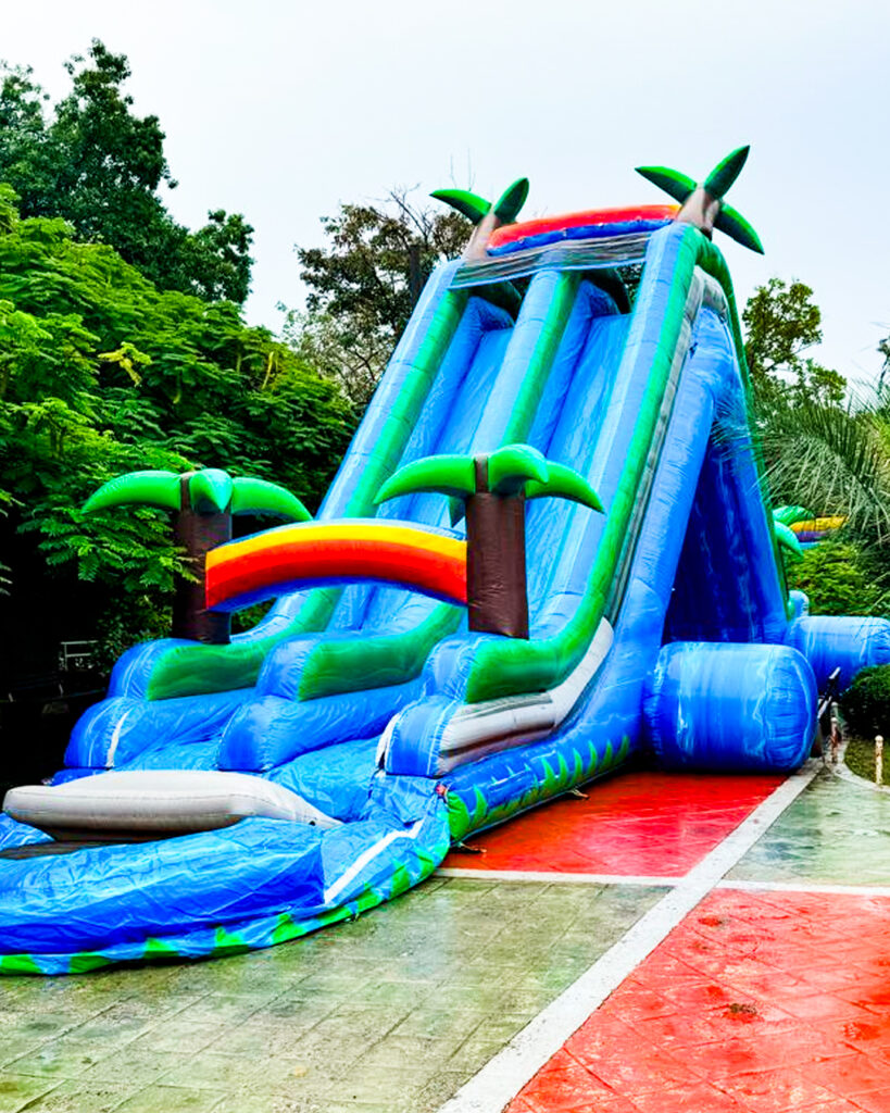 Nuestro Tobogán Inflable Tropical combina altura, color y emoción en una sola atracción. Con su diseño de palmeras, arcoíris y detalles playeros, convierte cualquier espacio en un verdadero paraíso de diversión.