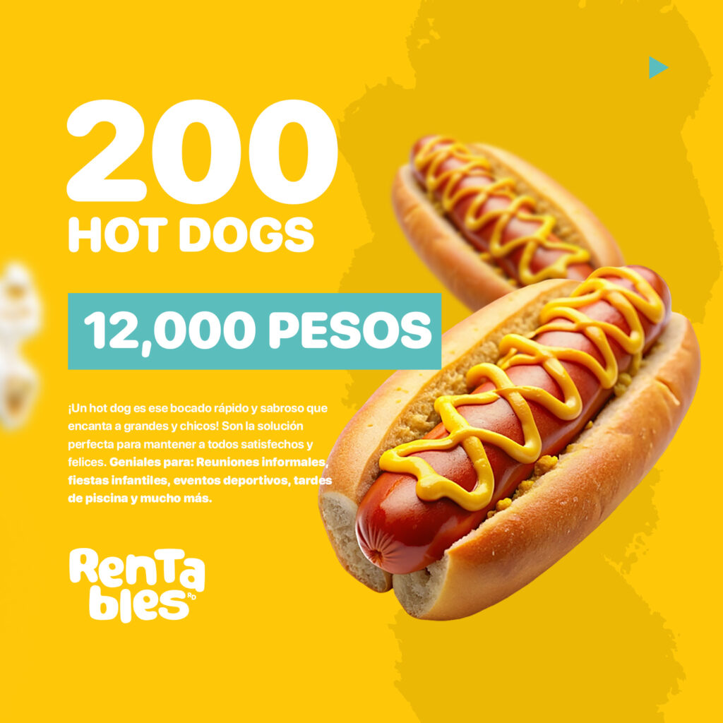 - 200 hot dogs listos para servir, con todo lo necesario para que tus invitados los disfruten al máximo.